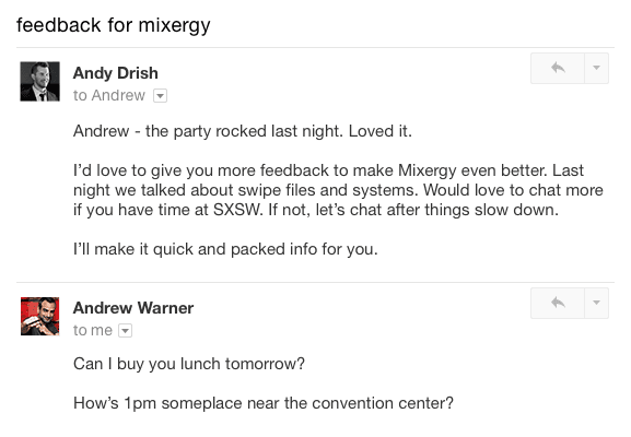 He was throwing a party at SXSW, and I could tell from listening to his interviews that heâs always craving and asking for audience feedback.