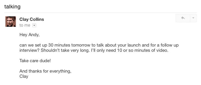 It was so cool to become friends with Clay. I remember reading his content online for so long. But I never thought weâd actually end up hanging out together. Since that experience, I realized this is a ninja hack for getting in touch with influencers who are normally unreachable.