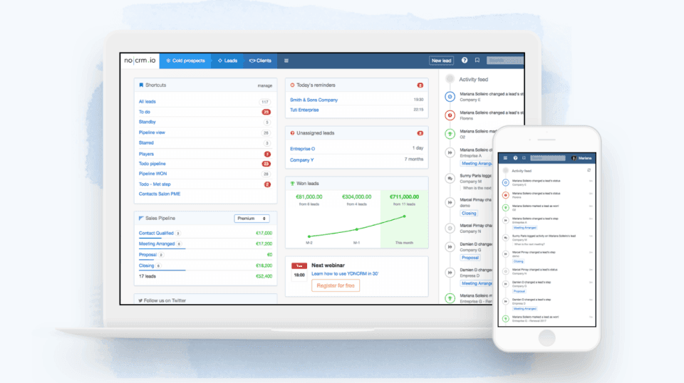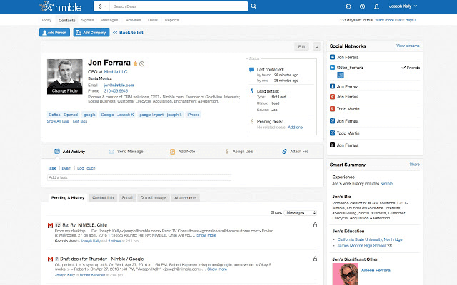 Nimble is the simple, smart CRM for Office 365 and G Suite that works for you by automatically combining your contacts, communication histories, email inboxes, and calendar appointments with over 160 SaaS business app contacts and social media connections (including Linkedin, Twitter, Facebook) into one unified team relationship manager.