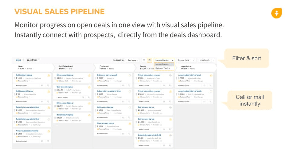 OnePageCRM is a simple, contacts-focused CRM. We take a to-do list approach to managing sales leads, where every contact has a next action to ensure you always follow-up. Capture leads from Gmail, Outlook, Twitter and Facebook and create a contact in OnePageCRM in just one click. Manage deals and track your sales targets using our intuitive sales pipeline. Integrate with all your favorite business apps. Got a question? We’re available via phone, chat, and email.