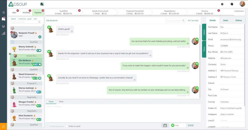 Adsoup is the ultimate unified inbox for Facebook messenger, Line, Livechat, Whatsapp, Email, Twitter direct messaging and more. By building the conversation directly into your sales pipeline and customer data, you can reduce the number of products you use while increasing the revenue attribution clarity. Make your sales relationship easy with Adsoup.