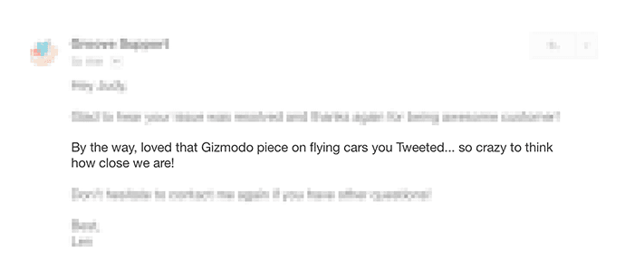 In Groove, a customer’s profile info comes with the ticket, so you can see stuff like their location, website, etc. Adding a little something you’ve noticed about a specific customer makes the interaction stand out way more.