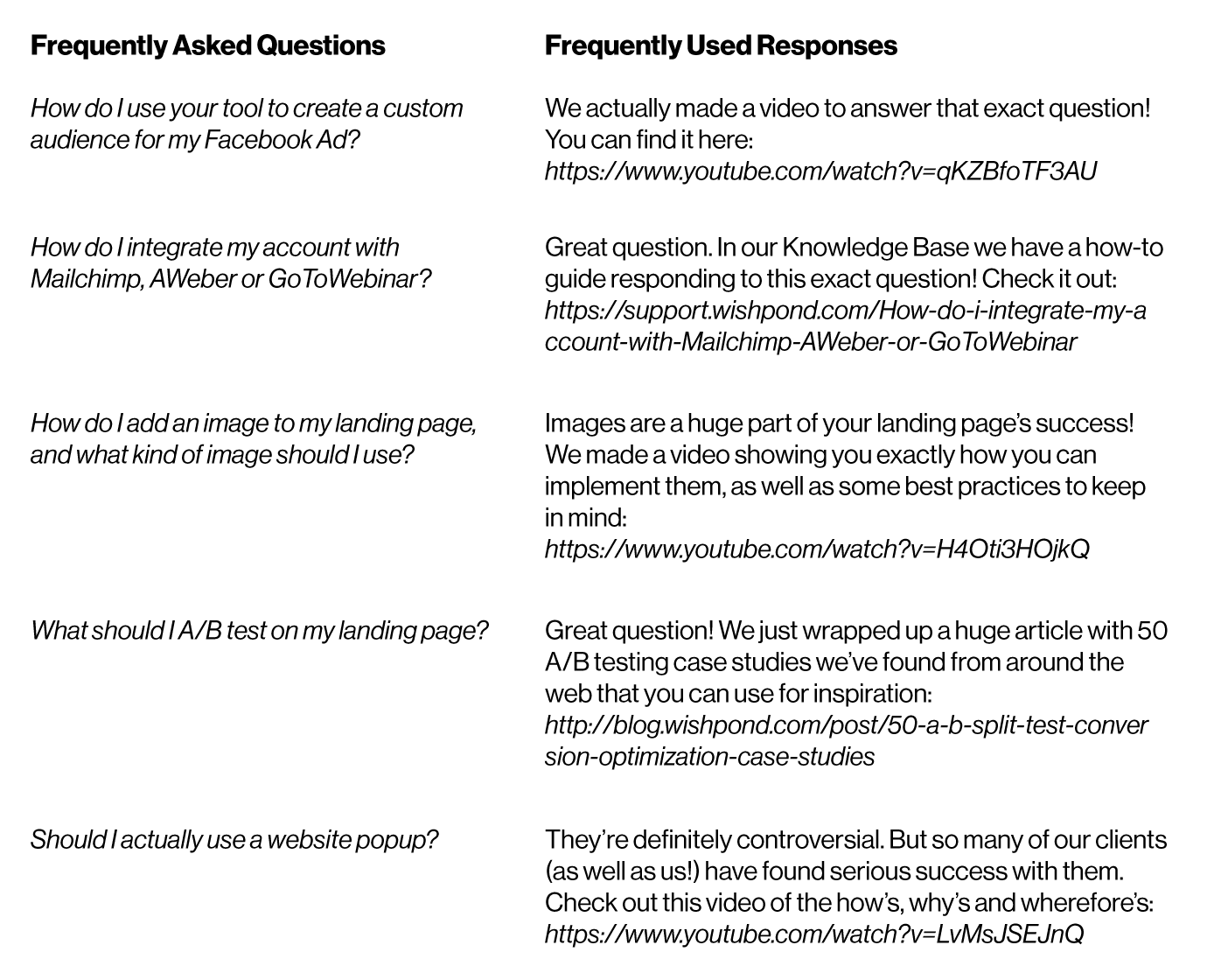 Some of the questions are straightforward, requiring only a “Great question! Just click the video icon, copy your video’s URL and you can add a video to your landing page.” You can also send visitors or clients to (if you use it) a Knowledge Base platform with FAQ’s and your corresponding answers.