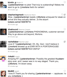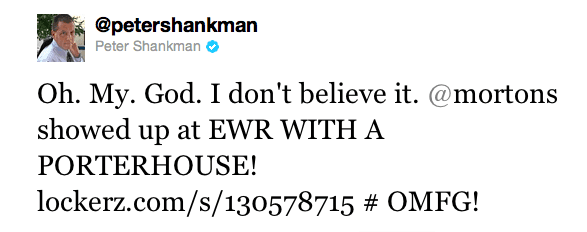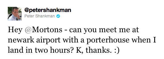 As Peter was boarding the plane in Tampa, he “jokingly” tweeted at Morton’s Steakhouse: