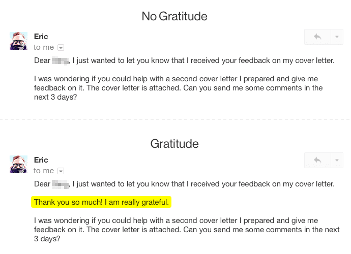 32% of the “No Gratitude” group provided feedback on the second cover letter, while 66% of the “Gratitude” group — more than double — sent more feedback.