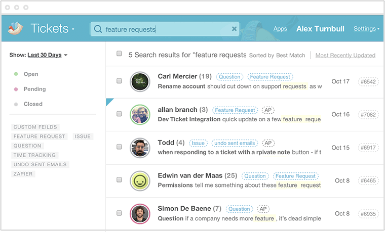 Our most requested feature. With advanced search, you can search for tickets by customer, label, keyword or phrase. Then, narrow down your search results by filtering a specific time period. You can also sort by status, agents or labels to help find the ticket you’re looking for faster. Search terms are highlighted in yellow wherever they appear, making scanning results even easier.
