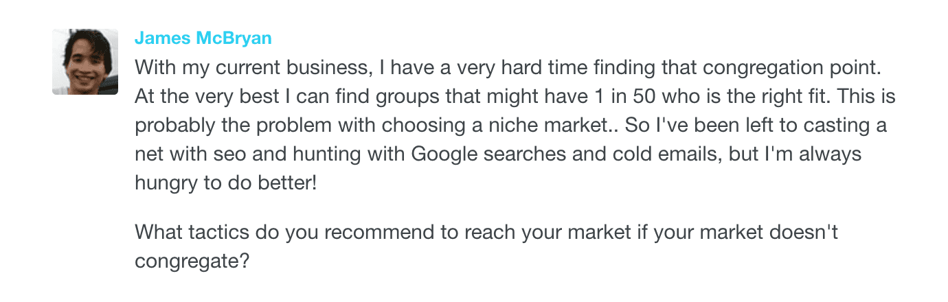 This comment appeared on a post about how to validate your business idea by finding the people in your market and learning from them. Part of the advice in the post was to find the places online that your market congregates: specialized forums, subreddits, blogs and the like.