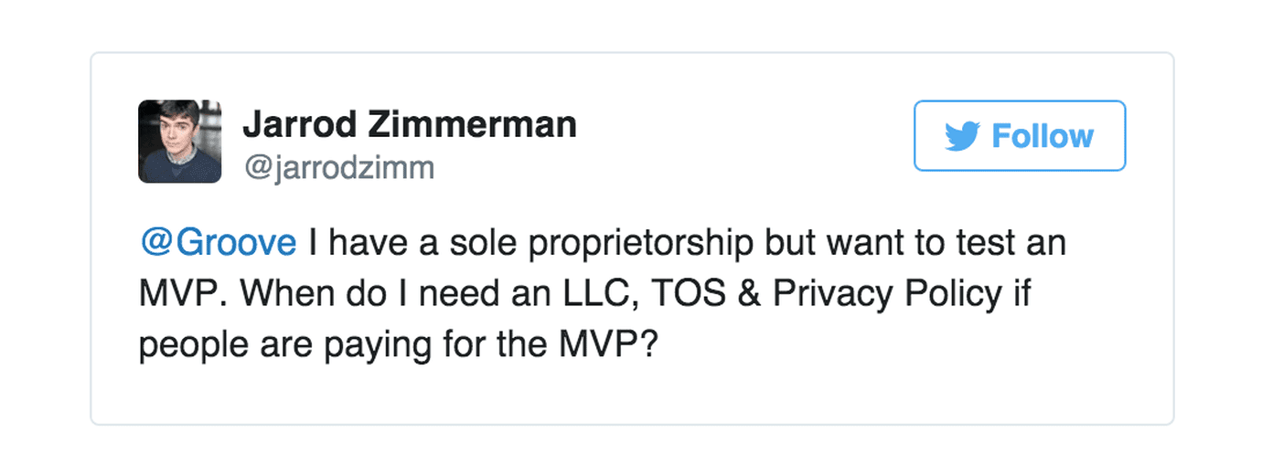 To that end, when I’m still at the MVP stage, I’ve used services like LegalZoom or Rocket Lawyer, both of which will help you incorporate for a few hundred bucks, and give you access to templated Terms of Service and Privacy Policy docs.