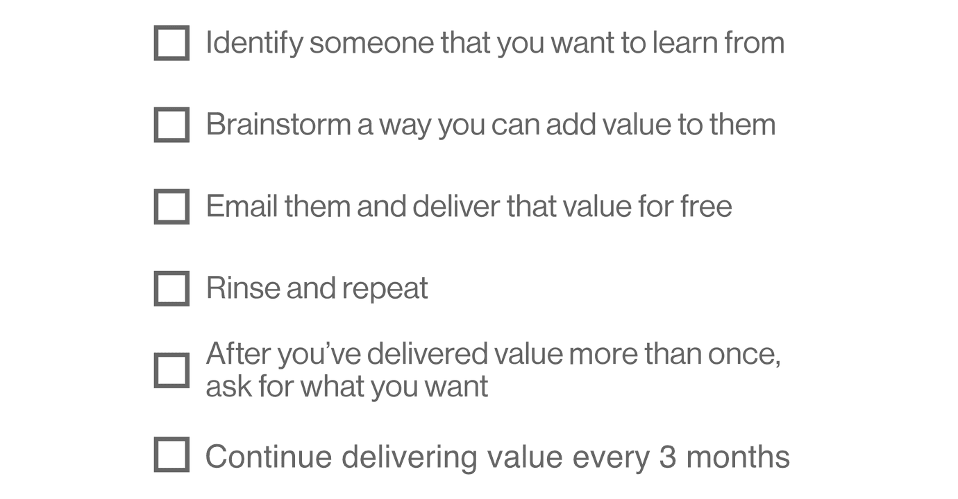 On a more general level, the “deliver value” part of connecting with mentors is not a one-time thing to get them in the door.