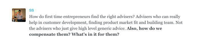 First of all, we’re not talking about cash compensation here. For advisors that you actually want, you won’t be able to offer enough cash to make things interesting for them (that is, they’re already financially successful). Anyone you pay for advice without having them invested in your success is simply a consultant.