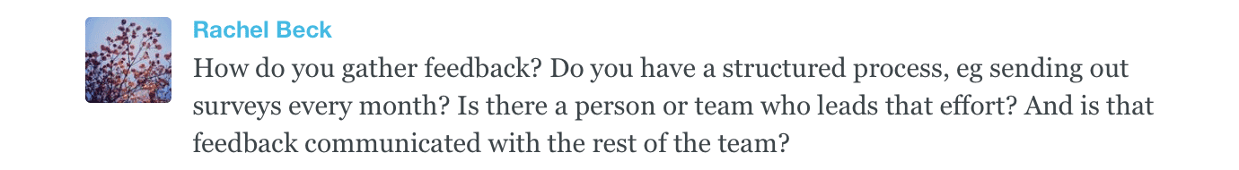 - Proactive outreach: We still send personal emails to a handful of customers each week as part of our continuous customer development efforts. We log all of the feedback we compile in a spreadsheet that’s shared with the entire team.