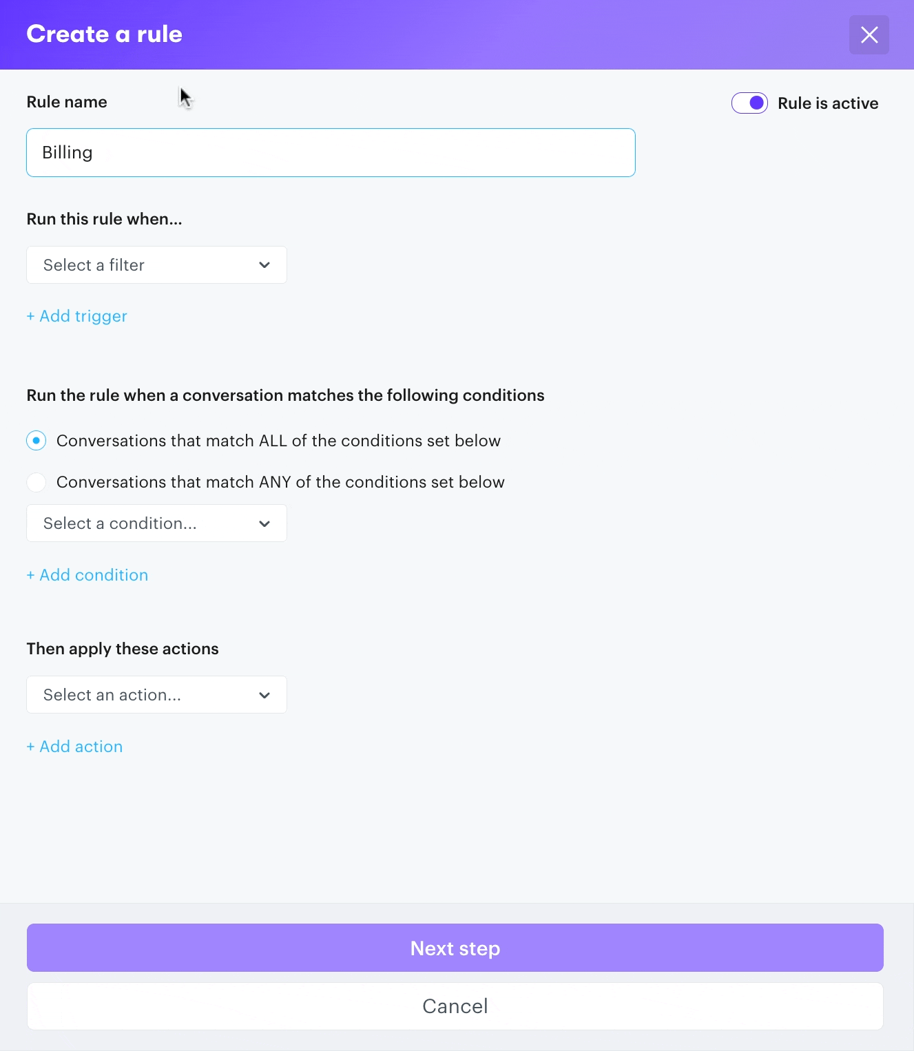 - New Firing Triggers: Choose from over 20 triggers based on message changes, teammate activity, and more. Set up round-robin assignments for incoming chats, bulk-tag conversations for easy organization, or automatically notify teammates when specific keywords are used.