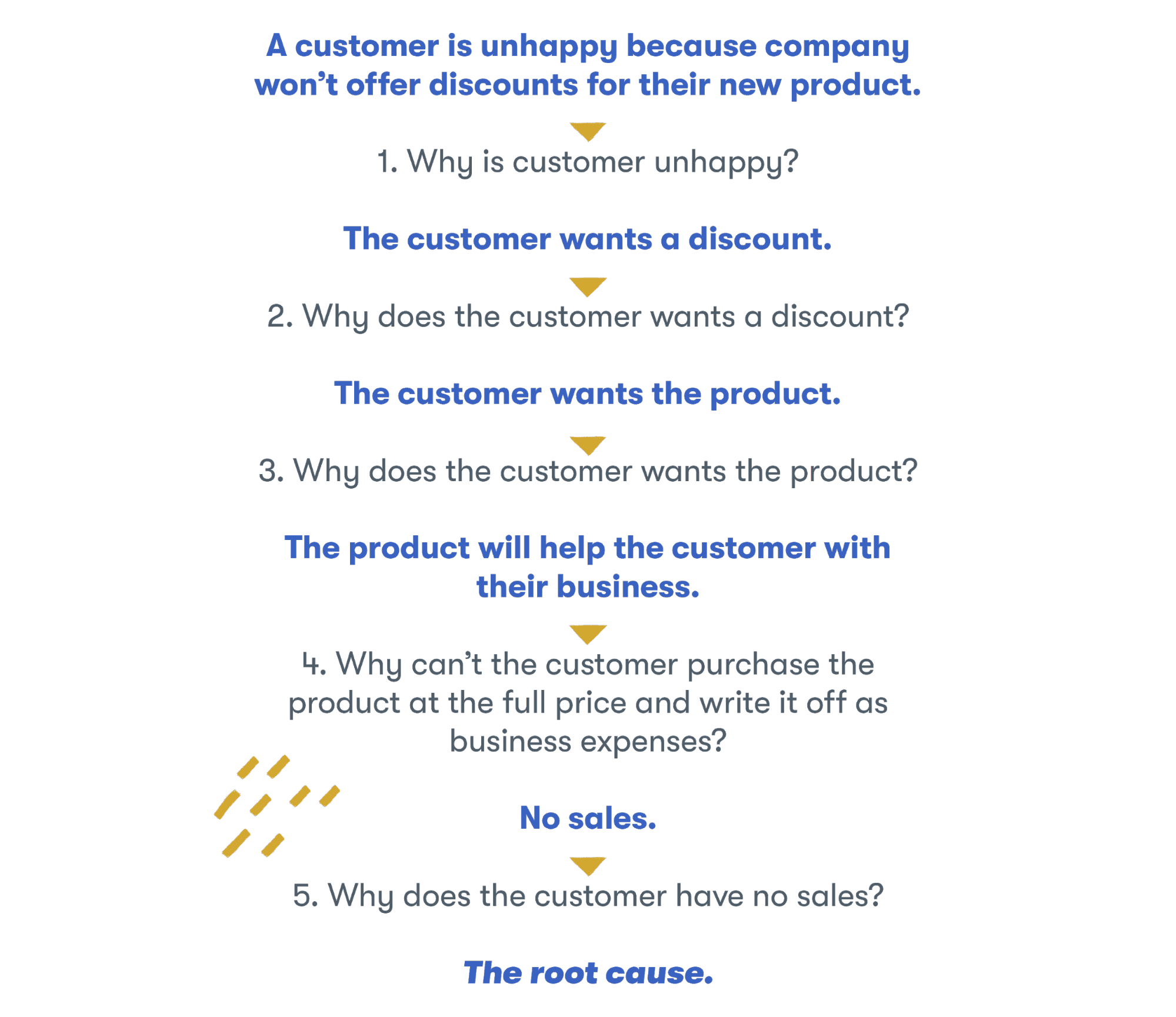 To use this framework, simply keep asking “why” until you get to the root cause of the customer’s issues.