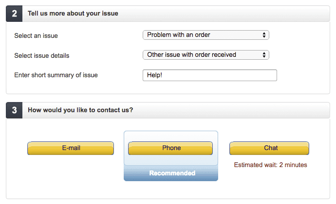 When you go through the “Contact Us” flow on Amazon, they’ll nudge you toward the contact method that has the shortest wait at any given time: