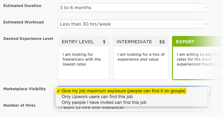 When an Upwork user creates a new job listing, they have the option to make the listing public (discoverable by search engines) or private (visible to Upwork users only).