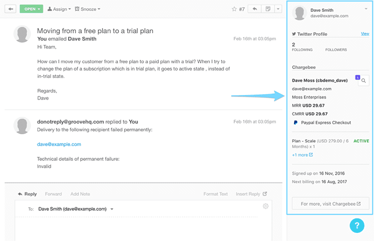 ChargeBee is a subscription billing solution for SaaS companies. With the Groove integration, you can add an HTML snippet to your Custom Profile App to easily access customer and payment integration from the sidebar of your tickets.