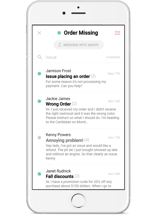Merging tickets on mobile is pretty cool, right? You’ll notice there is a new icon in the top right corner of the merge screen — tapping this will expand the merge list to reveal the first comment from each ticket in the list, so you can tell for certain you are merging the correct things.