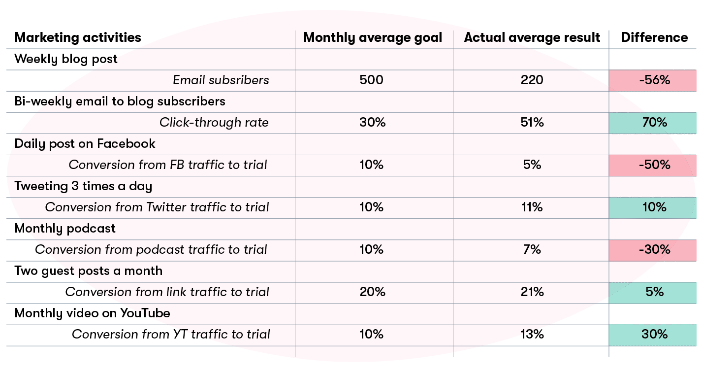Essentially, you will compile a summary of all the marketing activities your company does and see whether these activities are actually producing the results you expected them to.