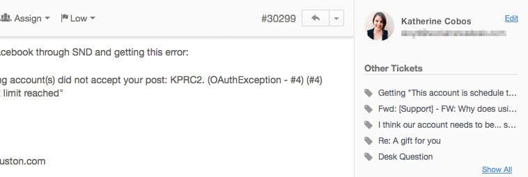 In the right sidebar of any Groove ticket, you’ll see the five most recent tickets from that customer.