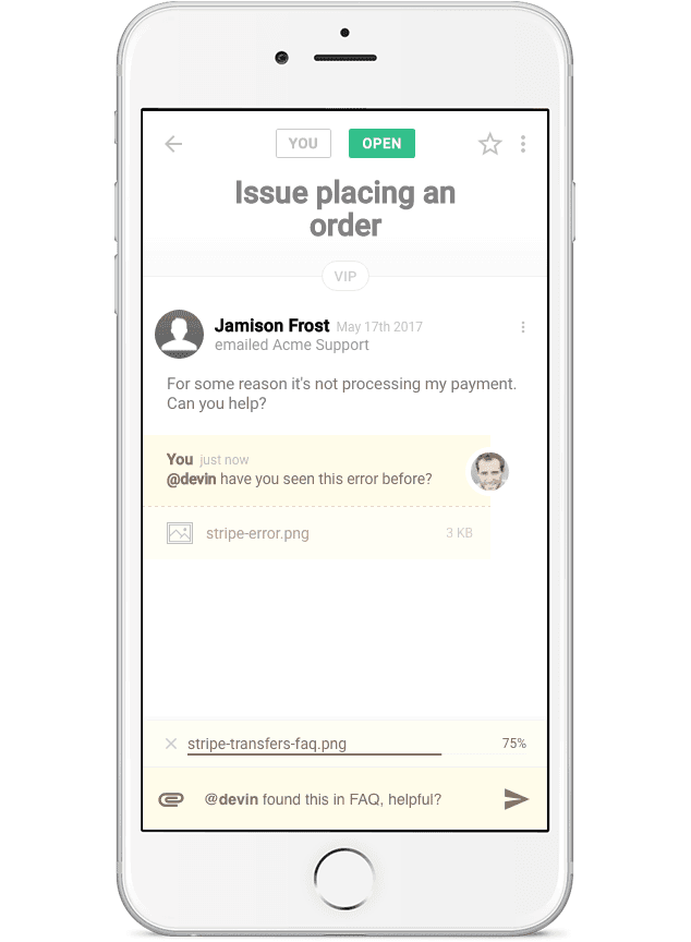 Did a customer contact sales instead of support? Not a problem! With a tap of the menu, you can move that ticket to the correct inbox without missing a beat.