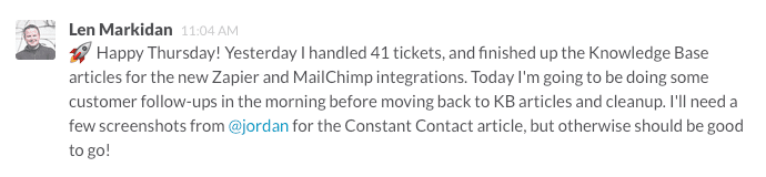 We use Slack for team chat, where each day every team member posts a daily standup, sharing what they accomplished the day before, what they’re working on that day, and any roadblocks that are in their way.