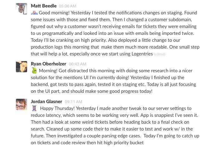 Every morning (whenever an employee’s morning might be), each team member posts an update in Slack, sharing what they accomplished the day before, and what they’ll be working on that day.