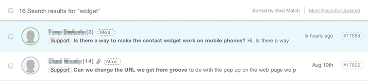 We’ve transitioned to a new search engine for Groove: ElasticSearch. The chief difference between ElasticSearch and our former search engine is the ability to make changes and adaptations to the search results based on real time updates. It also provides for a better user experience in search overall. You’ll notice a faster, more accurate search, and wildcard matching so partial words and phrases will show in your results.
