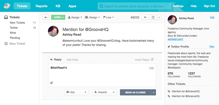 To take things a step further, our team uses the Twitter and Facebook integrations in Groove to get social media mentions right in our help desk, where we can create support tickets from social mentions and respond directly from the app.