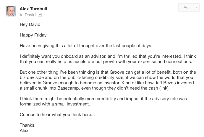 To a company that we want to bring on as a Groove customer, or to one that we want to work out a high-level partnership with, there’s a stark difference in how much value David’s engagement with Groove has depending on whether he’s an advisor who got some shares for answering questions for us, or an investor who believed in Groove enough to put some skin in the game.