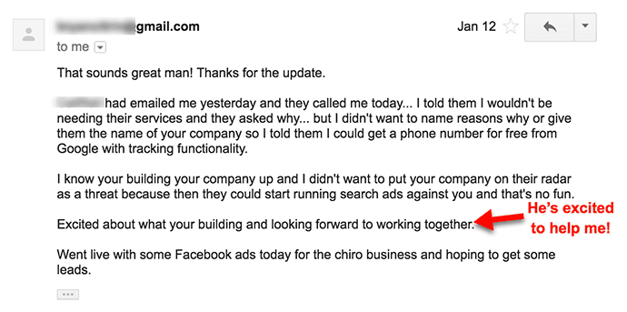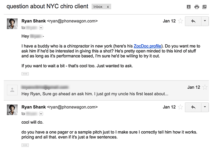 After this guy came on board as a paying customer, I continued to reach out and provide value relating to his business. One of my buddies is a chiropractor in New York and I emailed him asking if he would like a referral (huge value!).
