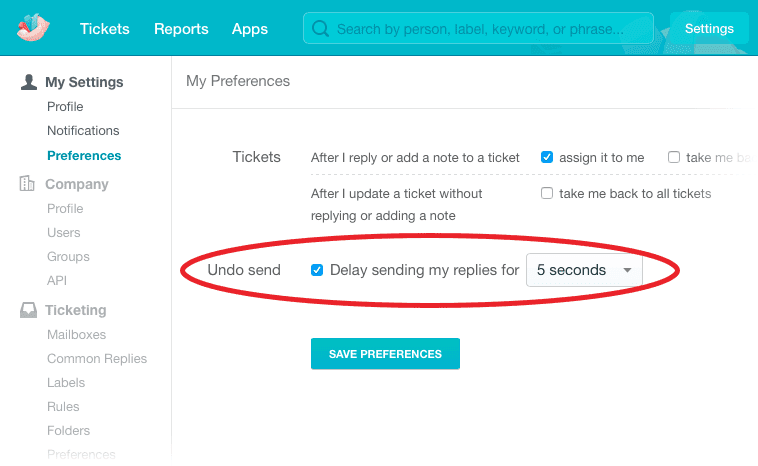 NOTE: If you’ve set your preferences to “take me back to all tickets” after you update a ticket, then your Undo send option will appear in the yellow notification at the top right of your screen.