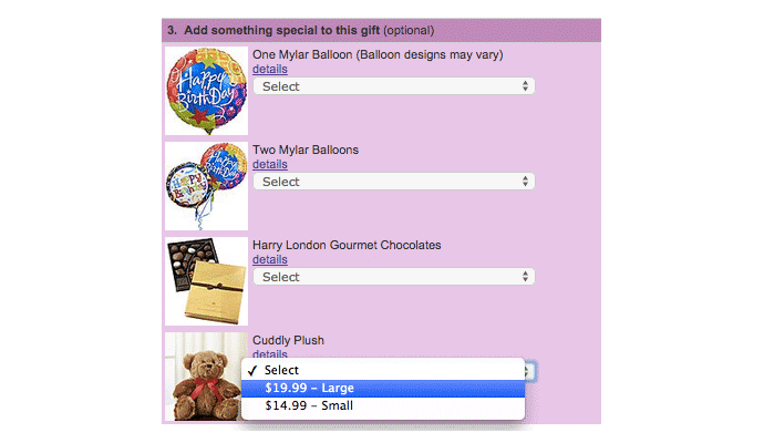 When you order flowers from 1-800-Flowers, you’ll get some simple upsells that are relevant and can help you send a better gift. For example, I get offered the option to add candy, balloons or a teddy bear: