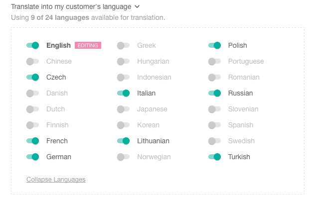In the near future we will be adding localization settings for the customer support widget. You will have the option to either allow the widget to automatically update based on the end user’s settings, or you can manually select from any of our 24 supported languages. This has been one of our most popular feature requests and we’re looking forward to getting it out the door!
